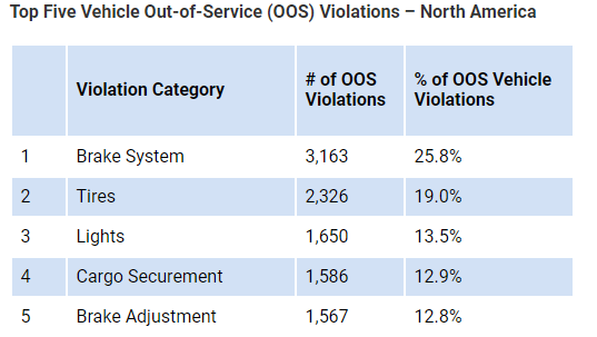 The top 2020 vehicle out-of-service (OOS) violations were brake systems, tires, lights, cargo securement, and brake adjustment.